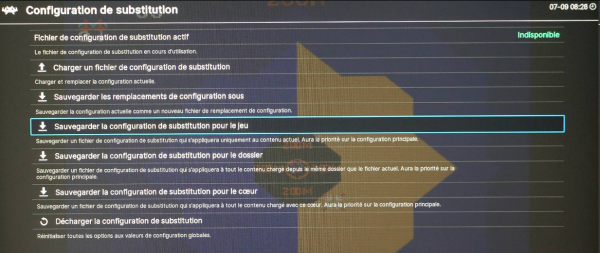 - "Menu principal", "Menu rapide", "Configuration de substitution", "Sauvegarder la configuration de substitution pour le jeu".