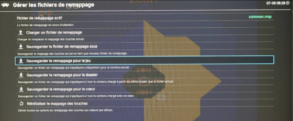 - "Menu principal", "Menu rapide", "Touches", "Gérer les fichiers de remappage" puis "Sauvegarder le remappage pour le jeu" (ou "Mettre à jour le fichier de remappage" si le fichier existe déjà).