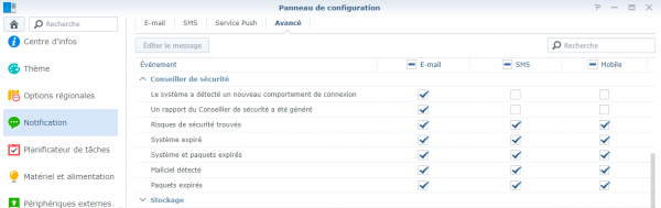 Ces alertes sont paramétrables depuis le panneau de configuration, dans la partie Notifications. Les 3 premiers onglets paramètrent chacun un canal d'alerte tandis que l'onglet Avancé permet de spécifier quels alertes recevoir (section Conseiller de sécurité). Choisissez le canal que vous préférez et faites un test afin de valider que vous recevez bien les alertes.