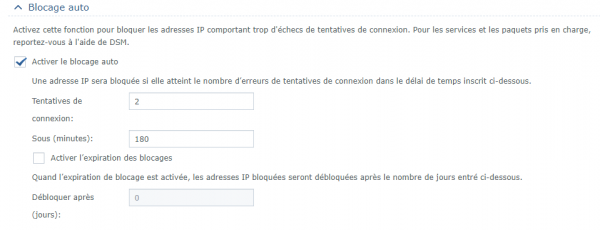 Dans le panneau de configuration, la section Sécurité présente des éléments intéressants pour bloquer les tentatives de connexion. L'onglet Compte propose de bloquer une IP pendant plusieurs minutes lorsque deux connexions ont échoué, avec possibilité de la débloquer automatiquement au bout d'un certain temps.