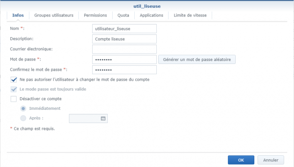 Il recommandé de créer un utilisateur dédié à l'utilisation de ce service, afin de limiter l'exposition des données partagées.