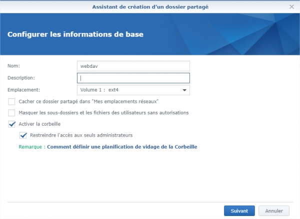 - Sur l'écran qui s'affiche, entrez un nom de partage (par exemple "webdav")