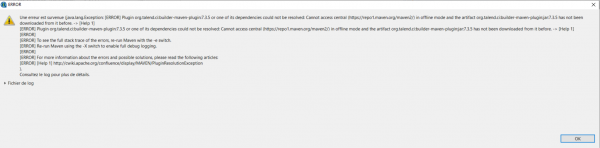 "Une erreur est survenue (java.lang.Exception: [ERROR] Plugin X or one of its dependencies could not be resolved: Cannot access central (https://repo1.maven.org/maven2/) in offline mode and the artifact X has not been downloaded from it before"