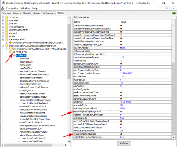 - Allez sur l'onglet MBeans et positionnez vous sur oracle.ucp.admin.UniversalConnectionPoolMBean. Attention : ce MBean n'apparaît qu'après la première connexion à la base de données.