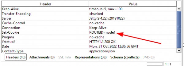 - Vérifier que les en-têtes affichent tantôt node1, tantôt node2 pour la valeur du cookie ROUTEID