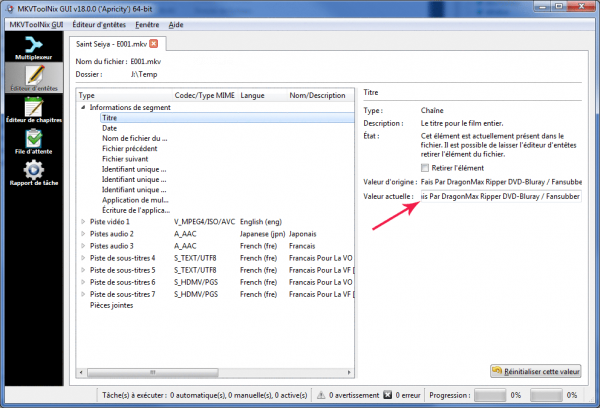 Pour supprimer le champ "titre" qui apparait sur un MKV téléchargé, il est possible d'utiliser le logiciel MKVToolnix.
