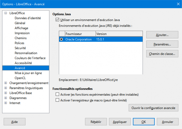 Pour corriger cela, une possibilité est donc d'installer Java ; LibreOffice détectera ensuite l'environnement Java automatiquement.