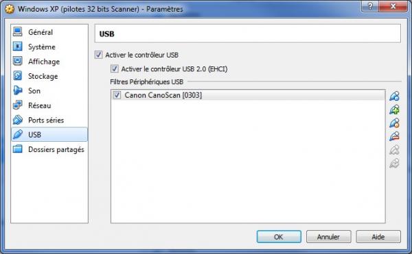 Sur la capture, j'ai créé un filtre sur le Scanner Canoscan 3000 (acheté en 2004). VirtualBox redirigera les flux USB du scanner vers la machine virtuel hôte, où le pilote les exploitera.