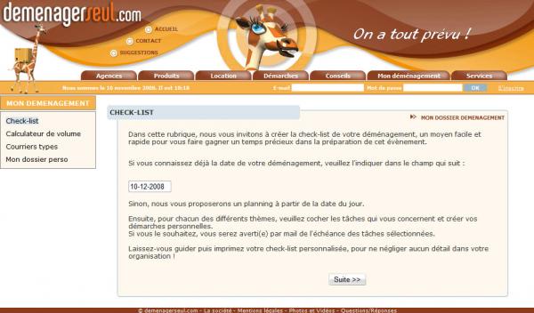 La première fonction permet de faciliter le déménagement en évaluant tout ce qui est nécessaire. On choisit la date grâce à un petit calendrier et on valide. L'écran suivant s'affiche alors :