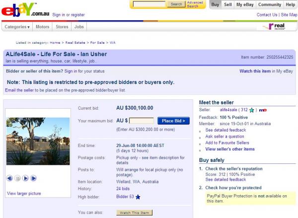 Ebay et ses enchères farfelues : après sa séparation, un américain, Ian Usher, a décidé de vendre tous ses biens sur Ebay : maison, voiture, moto, matériel, loisirs, boulot... même ses amis... en une seule enchère.