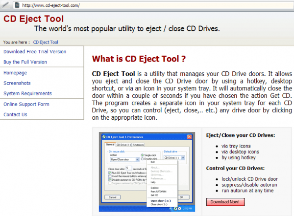 Le site CD Eject Tool est un site dédié à un logiciel permettant d'ouvrir le tiroir de votre lecteur CD/DVD. Ouvrir le lecteur CD... Vous savez, le même genre de fonction accessible par un clic droit sur votre lecteur et un clic sur le sous-menu "Ejecter"...