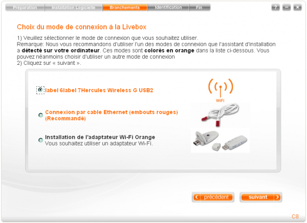 Tout d'abord, Orange propose un système d'installation clé en main : on insère le CD et tout est automatique. En lançant le logiciel, la clé USB Wifi est reconnue (Hercules Wireless) mais les développeurs ont juste omis d'affecter certaines valeurs à "label6" et "label7", deux composants texte pour afficher la description du périphérique...