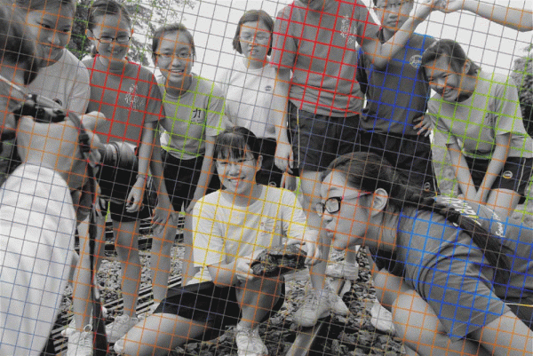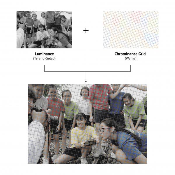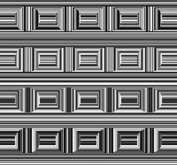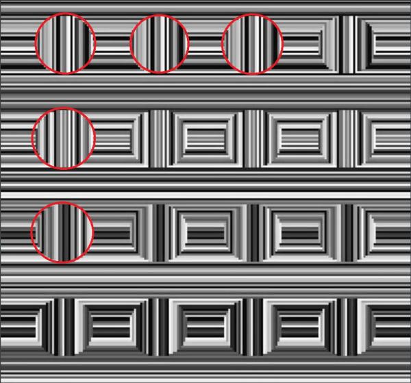 Une illusion de Øyvind Kolås, qui donne l'apparence d'une photo colorisée à une photo en noir et blanc, sur laquelle des lignes de couleurs ont été tracées.