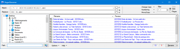 L'utilitaire RegexRenamer propose une solution pratique, en appliquant une expression régulière sur chaque nom de fichier, permettant ainsi d'extraire ses différentes parties. En quelques secondes, pour peu que l'on maîtrise un minimum les expressions régulières, on peut appliquer des remplacements efficaces.