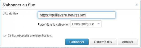 L'ajout de flux RSS se réalise rapidement et simplement : en cliquant sur le menu Action puis S'abonner au flux, l'écran ci-dessous s'affiche. Saisissez l'adresse web du flux à importer :
