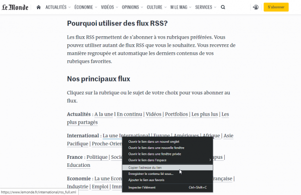 - En recherchant "Flux RSS Le Monde" sur un moteur de recherche, vous trouverez directement l'adresse des flux de ce journal