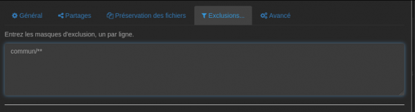 - Sur l'onglet Exclusions, vous pouvez ajouter des fichiers ou des répertoires à exclure (ci-dessous, exclusion de tous les fichiers et sous-répertoire de "commun").