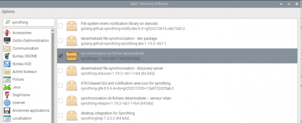 Par exemple, sur un Raspberry PI, vous pouvez lancer le gestionnaire de paquets, rechercher SyncThing et l'installer.