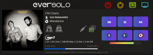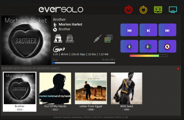 janv. 01 2025 | Bonjour Utilisateur de la version 1.0 , avec succès sur apache/php sur un raspberry PI J'ai voulu testé la 1.1 ce jour Voici ma config (ips et config inchangées entre la 1.0 et 1.1) pi@raspberrypi:/var/www/html/dmpa6/js $ cat config.js /* Eversolo DMP-A6 - Interface WEB Eric Quillévéré 2024 v 1.1 (26/12/2024) */ // IP of player const IP_DMP='192.168.1.60'; // IP of proxy (for CORS calls). Can be the same as current server const IP_PROXY='192.168.1.14'; const PORT_PROXY='8181'; const SHOW_COVERS_ON_SEARCH=true; // Show covers on search by albums (grid otherwise) const USE_PROXY_FOR_COVERS=true; // Use proxy for loading covers (faster because browser can use cache) const LAZY_LOADING=true; // Load covers with lazy loading (faster) // Proxy to access title information const URL_PROXY='http://' IP_PROXY ':' PORT_PROXY '/proxy/?url='; J'ai un message d erreur dans les logs APache [Wed Jan 01 12:15:53.194649 2025] [:error] [pid 31049] [client 192.168.1.49:50927] PHP Notice: Undefined variable: sURL in /var/www/html/dmpa6/proxy/index.php on line 12, referer: http://192.168.1.14:8181/ Sur Chrome via http://192.168.1.14:8181/ la page s'affiche globalement (icônes et mise en page pétée nouvelles fonctions inaccessibles) avec ceci DMP player is not detected on IP 192.168.1.60, with PROXY 192.168.1.14. 01/01/2025, 12:15:28 Sur Safari via http://192.168.1.14:8181/ la page n'affiche que le logo et ce message et rien d 'autre DMP player is not detected on IP 192.168.0.100, with PROXY 192.168.0.1. 01/01/2025, 12:20:11 J'ai relancé Apache , et le PI sans succés Je pense qu'il y a un petit soucis dans le code, mais cela dépasse mes compétences techniques ;) Merci en tout cas pour ce super outil, et meilleurs voeux pour 2025 Cdt madmike31@hotmail.com | MADMIKE92 |