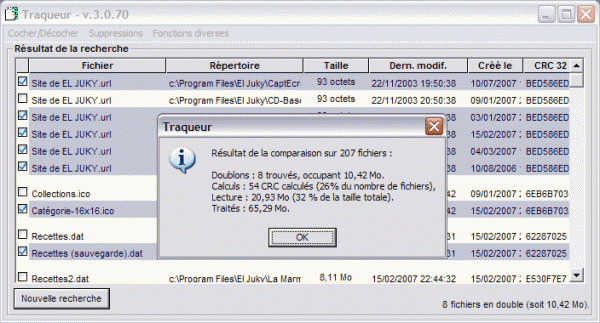 Avec Traqueur, vous pouvez rechercher tous les fichiers en double, et ce au moyen de plusieurs options : recherche sur les fichiers portant le même nom, la même date, la même extension, le même contenu.
